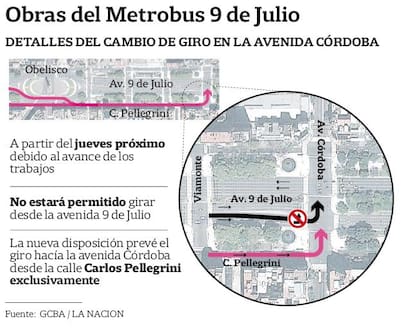 Mientras avanzan las obras del Metrobus, que recorrerá la avenida 9 de Julio entre Constitución y Retiro, el gobierno porteño comienza a instrumentar cambios en el tránsito. Por caso, desde el jueves el giro hacia la avenida Córdoba deberá realizarse exclusivamente por Carlos Pellegrini.