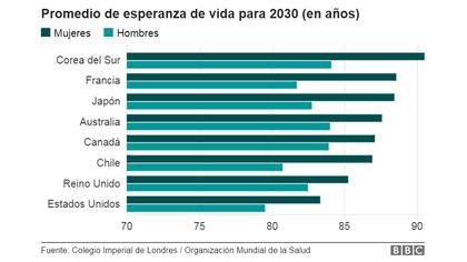 "Además, el el primer país en el que sus habitantes han dejado de crecer en altura, lo que demuestra algo sobre los primeros años de nutrición". Estados Unidos será superado por Chile, donde se espera que las mujeres que nazcan en 2030 vivan 87 años y los hombres 81. Por otro lado, entre 2015 y 2030, se espera que el promedio de vida para de 79 a 82 en los hombres y de 83 a 85 entre las mujeres.