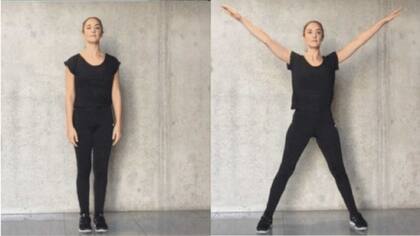 - Pegá un salto abriendo los pies y al mismo tiempo elevando los brazos de costado, por encima de tu cabeza