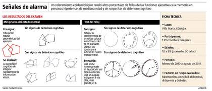 En un relevamiento epidemiológico realizado en el corazón de la provincia de Córdoba, un equipo local determinó con una batería de tests que hasta el 45,6% de los hipertensos con una edad promedio de 50 ya tenía algún signo sospechoso de deterioro cognitivo o demencia. Los principales problemas detectados fueron de memoria o las fallas en las funciones ejecutivas, que son las que nos permiten organizar las tareas del día, saber cómo llegar a un lugar, mantener una conversación o utilizar el dinero, entre tantas otras.