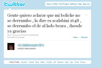 Poco antes de las 9, a través de la red social, con el usuario @vicdalessandro emitió el siguiente mensaje: "Gente quiero aclarar que mi boliche no se derrumbo, la dire es scalabini 1648 , se derrumbo el de al lado beara".