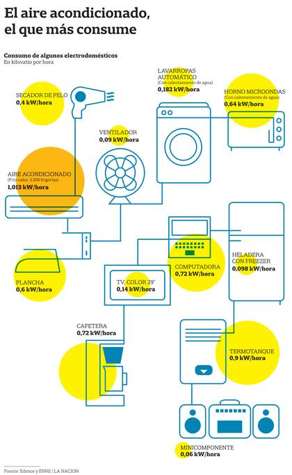 Pero también se consume para enfriar. Infaltable en el verano, el equipo de aire acondicionado no es sólo uno de los favoritos de los compradores, sino también el 5° posicionado entre los aparatos que más consumen, según la lista que confecciona el Ente Nacional Regulador de la Electricidad (ENRE).