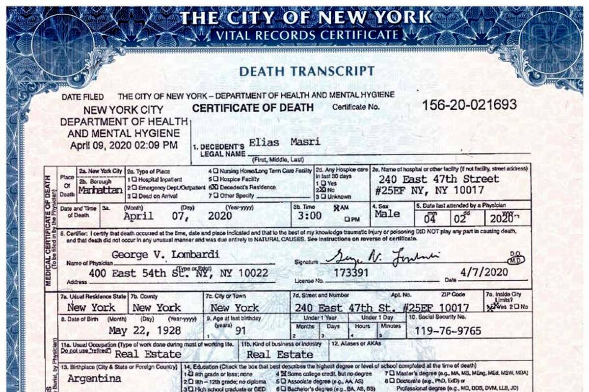 El texto continúa: "Elías Masri falleció en la ciudad de Nueva York el pasado 7 de abril de 2020. La causa fue una insuficiencia cardiorrespiratoria a causa del virus Covid-19. El mismo día de su fallecimiento la casa funeraria, Frank Campbell Funeral Home, con sede en Nueva York, trabajó en la preparación del cuerpo para ser trasladado a la ciudad de Buenos Aires cuando fuera posible, ya que sus deseos y los de su familia eran ser enterrado junto a su mujer en su país. A pedido nuestro, el cuerpo se preparó cumpliendo con todos los protocolos y especificaciones que requiere la autoridad estadounidense en casos de muertes por enfermedades infectocontagiosas. Entre los procesos realizados, es importante aclarar que el cuerpo fue embalsamado, colocado en un ataúd especial de metal que posteriormente es cerrado al vacío y sellado de manera hermética, lo que anula toda posibilidad de contagio de Covid-19".