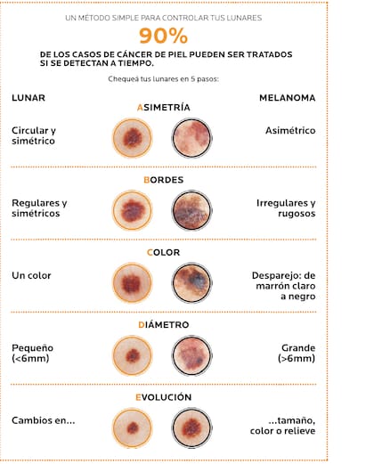Por eso, desde la semana pasada y hasta el 31 de enero del año próximo, La Roche-Posay impulsa la campaña Skin Checker, con el fin de que cualquier persona pueda chequear sus lunares, y también los de su círculo íntimo para detectar irregularidades y sospechas. "Es una regla nemotécnica empleada en todo el mundo [divulgada por La Fundación del Cáncer de Piel] , fácil de recordar y de poner en práctica -dice la dermatóloga Cristina Borroni, especialista del Hospital Italiano y asesora de la firma La Roche-Posay. Sólo hay que recordar las letras ABCDE y seguir los cinco pasos".