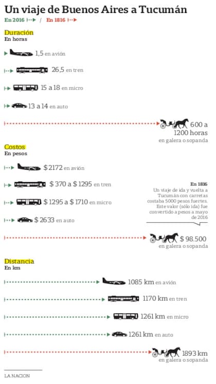 Sin embargo, llegar a Tucumán en 1816 no era tan simple como hacerlo hoy en automóvil, ómnibus, tren o avión. Sólo había galeras y sopandas para los pasajeros más acomodados y tropas de carretas para la carga y viajantes, que iban por las huellas y sendas que conformaban el Camino Real, que, en no pocas zonas, incluyendo el vadeo de ríos y arroyos, sólo los baqueanos podían seguir con seguridad.