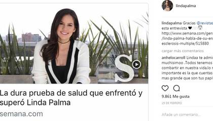 Linda Palma, presentadora del canal Caracol de Colombia, fue diagnosticada hace diez años, cuando tenía la edad de 20. En septiembre de 2016, la conductora de Yo me llamo, La voz y A otro nivel, había sobrellevado la enfermedad sin compartirlo con el público, pero una recaída la obligó a retirarse de la televisión para someterse a un tratamiento y volvió a aparecer en Instagram cuando los síntomas remitieron. Perdió la movilidad, el habla, la sensibilidad del lado derecho de su cuerpo, sufrió ataques agudos de vértigo y entró en una profunda depresión. Ella misma explicó en sucesivas entrevistas cómo vivió la experiencia y cómo pudo salir fortalecida: “Esto que sucedió fue inesperado para todos, sabíamos que se podía presentar, pero no éramos conscientes de lo fuerte que podía llegar a ser. Pasé por muchas cosas que han sido muy difíciles para mí. Durante varios días no pude levantar la cabeza, hacerlo me hacía vomitar de inmediato. Mi mamá tuvo que bañarme durante dos meses porque no me podía sostener, ni siquiera estando sentada... Fue bastante duro, muy doloroso, muy triste. También padecí nistagmo, que son movimientos involuntarios de los ojos que me impedían enfocar cualquier cosa que miraba, así que prefería no abrir los ojos”.