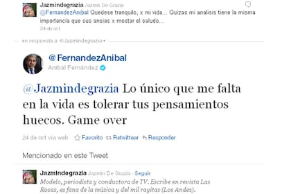 Fernández: "@Jazmindegrazia Lo único que me falta en la vida es tolerar tus pensamientos huecos. Game over"
