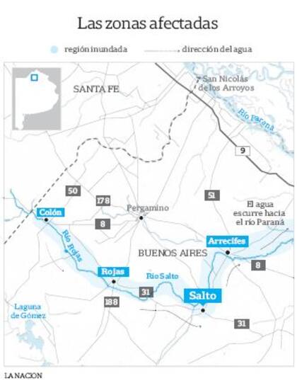 El intendente de Salto, Ricardo Alessandro, calificó la situación como "gravísima" y explicó que el agua va de Colón a Rojas, de esta localidad a Salto y de ahí a Arrecifes.