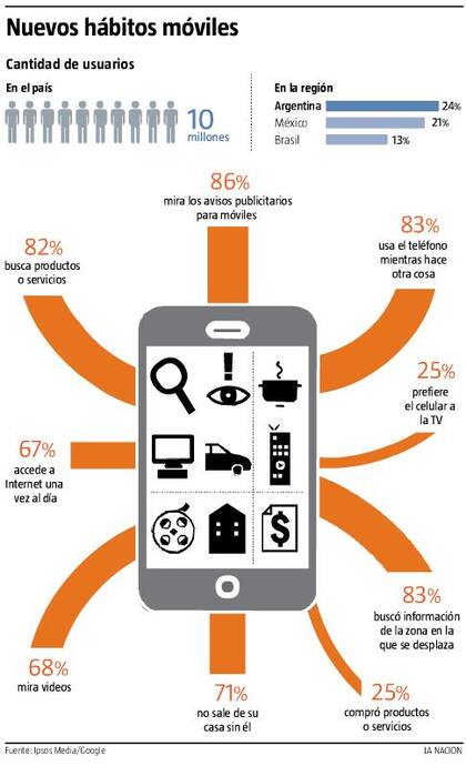 Estos datos surgen de una investigación realizada por Ipsos Media para Google sobre mil usuarios de entre 18 y 64 años. Ese trabajo concluyó también que para los usuarios sus teléfonos móviles inteligentes son indispensables para su vida cotidiana, y empezaron a modificar muchos hábitos, particularmente la forma en la que se compra y publicita. Por la baja en los precios y la actualización en los modelos, "la adopción de smartphones será del 100% en breve", sostiene el estudio.