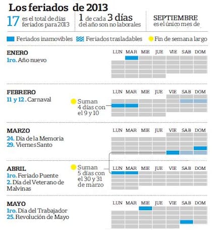 El Ministerio del Interior determinó 17 recesos para 2013, que se traducirán en siete fines de semana largos