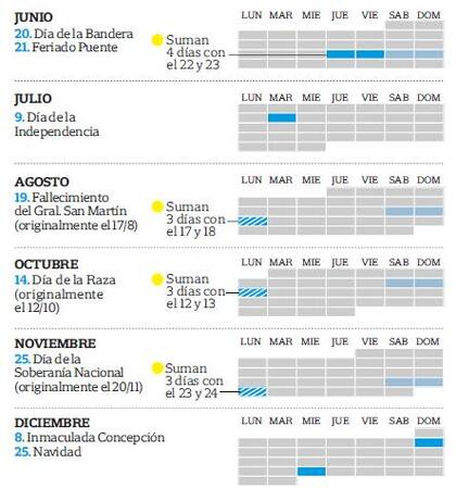 Entre las principales fechas se destacan las de Carnaval, que son el lunes 11 y martes 12 de febrero, y los días de Semana Santa. Es que al jueves 28, declarado no laborable aunque sin ser feriado, se le sumará el viernes 29 de marzo, el lunes 1° de abril como feriado puente y el 2 en el que se conmemora el día de los caídos en la Guerra de Malvinas.