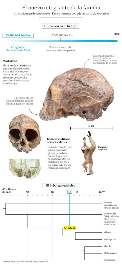 "Para dejarlo en claro: éste no es exactamente el ancestro común de humanos y simios (las chances de encontrar un ancestro preciso de cualquier grupo son muy pequeñas) -aclara por mail Chris Gilbert, del Hunter College, en Nueva York-, pero es un fósil íntimamente relacionado con ese estadio evolutivo. Y dado que está vinculado con el ancestro de todos los simios vivientes y los humanos, nos da una buena idea de cómo ese ancestro común puede haber sido. El valor de este espécimen es que se encuentra más completo que ningún otro conocido y representa un grupo de simios sobre los que veníamos discutiendo desde hace bastante tiempo. Nuestros análisis muestran que esta apariencia evolucionó muchas veces en simios extintos y no sólo en los gibones."