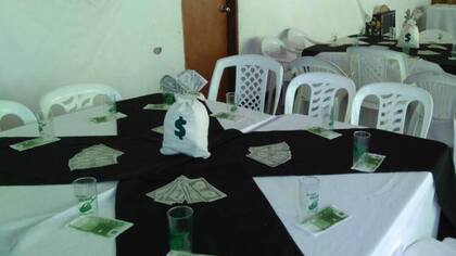 Además de los originales vasos, había bolsas de dinero, billetes y monedas desparramadas por todo el salón, decorado con los colores verde y blanco, en alusión al dólar. La celebración se llevó a cabo en Uruguay, donde está viviendo Vitette Sellanes.