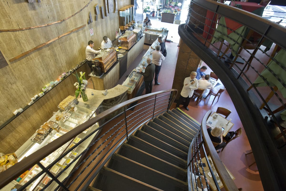La barra es abierta y está bajo un techo de doble altura, lo que genera una sensación de amplitud y modernidad. También se respira un aire de antiguo abolengo, con las tazas que tienen la filigrana "FG" y un borde dorado colmadas de un blend de café, que los clientes, por lo general, prefieren beber en la barra, parados, una de las costumbres que ya casi se perdieron.