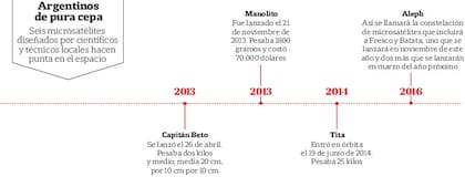 Los precedieron tres aparatos de ensayo puestos en órbita en dos años: Capitán Beto, el 26 de abril de 2013; Manolito, el 21 de noviembre de ese mismo año, y Tita (por la inolvidable morocha argentina), el 20 de junio de 2014.