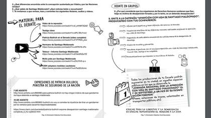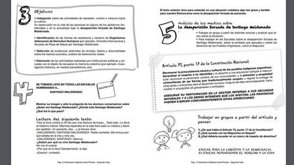 Los manuales que difundió el gremio incluyen orientación didáctica para los tres niveles: inicial, primario y secundario. Para cada uno se elaboró una guía para introducir contenidos. En todos los materiales se da por hecho que Maldonado es víctima de una desaparición forzada, a manos de la Gendarmería, algo que la Justicia aún no ha podido determinar. También se citan fuentes periodísticas y didácticas alineadas con esta hipótesis. Y no abre el espectro a otras líneas de investigación.