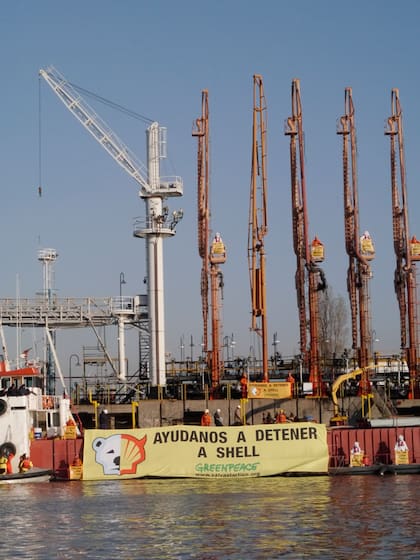 Un grupo de 35 activistas de Greenpeace protagonizaron esta mañana la ocupación de la plataforma de descarga de la petrolera Shell en Dock Sud para exigir a la compañía que frene sus planes de realizar exploraciones en el Artico.
