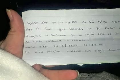"Quien alla encontrado a mi hijo Mateo le pido por favor que llame a su papá se llama Joaquín y todavía no lo sabe, este es su número no puedo cuidarlo ni tenerlo (sic)", dice la primera parte de la nota, junto a un número del teléfono.