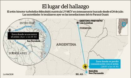 Según pudo saber LA NACION, la aeronave se encontró durante un recorrido aéreo que estaba realizando una unidad de la Administración Nacional de Aviación Civil (ANAC), un Cessna 182, en el río Paraná Guazú, a pocos kilómetros de la conexión con el río Barca Grande. "Es una zona que los aviones de búsqueda sobrevolaron al menos 50 veces", dijo Juan Iroigoin, presidente del organismo. Además, indicó que el avión hallado "habría caído en picada" lo que provocó un agujero en la tierra en una zona pantanosa y muy cerca del último punto reportado por el radar.