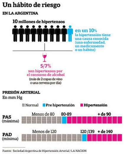 Así surge de un cruce de estadísticas que hizo la Sociedad Argentina de Hipertensión Arterial (SAHA). En nuestro país, la III Encuesta Nacional de Factores de Riesgo, que el Ministerio de Salud difundió el año pasado, reveló que hay 10 millones de hipertensos y que apenas un 58% de esa población está bajo tratamiento. Una proporción bastante alta, de acuerdo con los especialistas, es atribuible al exceso con la bebida.