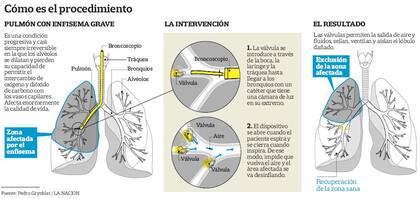 "Se produce en una parte de los pacientes con enfermedad pulmonar obstructiva crónica [EPOC], que en nuestro país padecen alrededor de tres millones de personas –explica Grynblat, también jefe de endoscopia del Hospital María Ferrer y maestro instructor de Bronchoscopy International–. Hasta ahora, la única posibilidad de tratamiento que había en los casos graves era una operación «a cielo abierto», una gran cirugía de reducción de volumen que exige cuatro o cinco días de terapia intensiva, drenajes pleurales durante entre 36 y 72 horas, y riesgo de complicaciones. Esto, en cambio, se hace a través de una broncoscopia como la que se practica con fines diagnósticos. Se ingresa a través de la boca, la laringe, la tráquea, los bronquios y se busca el segmento que está afectado. Fisiológicamente es similar, porque la cirugía saca la parte afectada del pulmón; la válvula excluye funcionalmente esas zonas sin sacarlas."