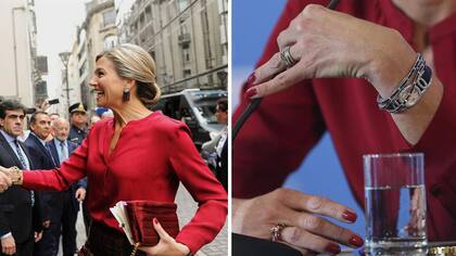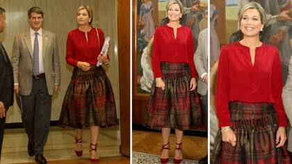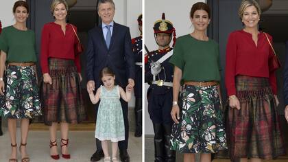 La reina Máxima apostó por un outfit más otoñal: camisa de cuello levemente cerrado en tono tomate y falda amplia por debajo de la rodilla de estampa escocesa. A diferencia de Awada, eligió sandalias cerradas en punta de género velvet que iban a tono con el resto del equipo. En cuanto a su look de belleza, también llevó el pelo recogido con muy poco maquillaje y aros colgantes de mostacilla en color negro.