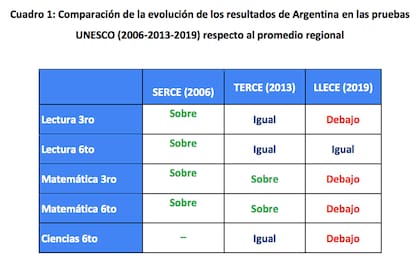 Un estudio que fue llevado a cabo en 2019 por el Laboratorio Latinoamericano de Evaluación de la Calidad de la Educación (LLECE), realizado por la Oficina Regional de Educación para América Latina y el Caribe de la Unesco, donde se evaluó el desempeño en Lengua, Matemáticas y Ciencias Sociales de estudiantes de 3° y 6° grado de 16 países de América Latina y el Caribe, muestra que la Argentina está por debajo del promedio regional en cuatro de las cinco evaluaciones.