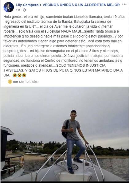 Lily Campero relató el asesinato de su hijo en un grupo de Facebook que conmovió a Internet. "Él era mi hijo, Sarmiento Braian Lionel se llamaba, tenía 19 años, egresado del Instituto Técnico de la Banda (del Río Salí). Estudiaba la carrera de Ingeniería en la UNT. Ayer le quitaron la vida para intentar robarle", así comienza el texto que compartió la madre de Braian, en un grupo de vecinos de Alderetes en Facebook.