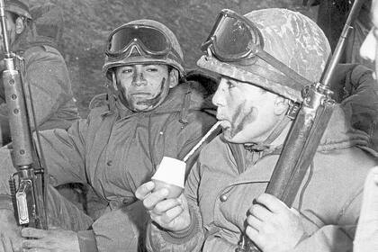 El viernes 2 de abril de 1982, una segunda edición de LA NACION informaba antes que nadie que las Fuerzas Armadas habían iniciado el desembarco en las islas. Abajo, soldados argentinos durante la guerra.