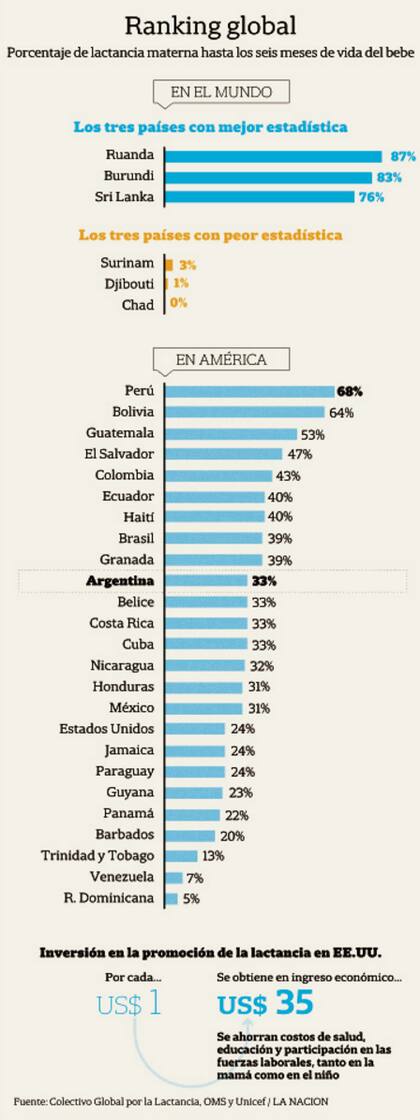 "Las tasas de lactancia en América latina son más bajas que el promedio mundial y la de la Argentina es aún más baja que el promedio de su región", indicó a LA NACION el epidemiólogo Laurence Grummer-Strawn, del Departamento de Nutrición para la Salud y el Desarrollo de la OMS.