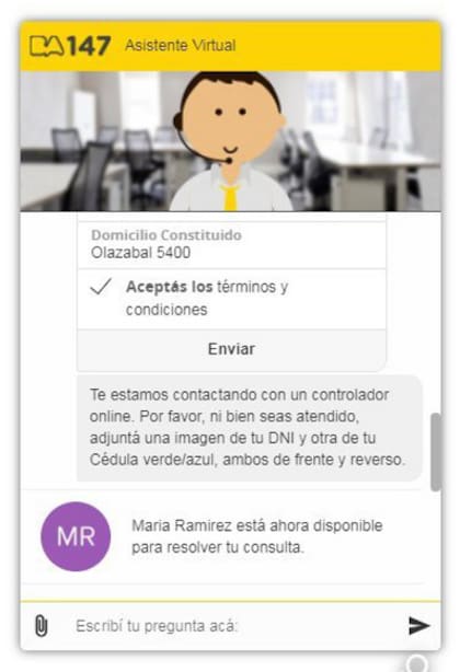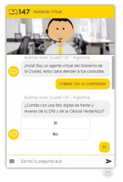 El funcionamiento es sencillo. Al abrir la web del Gobierno se ofrece un chat y para acceder al servicio basta escribir "chatear con un controlador". El sistema le pedirá al usuario una foto del DNI, de frente y de perfil, y de la cédula verde del vehículo en infracción, más otros datos. Al aceptar los términos y condiciones el vecino podrá ser derivado a un controlador con quien seguirá el trámite. La operatoria se puede realizar, de la misma manera, con un asesor virtual de la línea de reclamos.