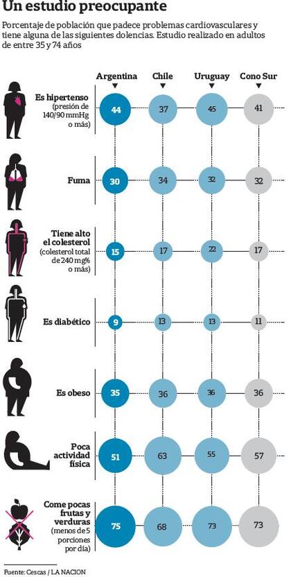 Aunque las cifras varían, "no hay grandes diferencias con Chile y Uruguay", aclara Irazola. Los resultados de la Argentina son algo mejores que en los países vecinos. En el mundo, ya se está empezando a ver un descenso de la carga de los factores de riesgo en la población. Aun así, continúan siendo el principal problema de salud pública. En nuestro país, existen distintas iniciativas para reducirlos. "Es cierto que la genética importa, ya que la hipertensión y el colesterol alto tienen un alto componente hereditario, pero el 80% del riesgo cardiovascular lo representan los factores de riesgo modificables. Esto significa que el sedentarismo, el tabaquismo y el sobrepeso se pueden combatir. Y, si se revierten, las chances de padecer una enfermedad del corazón disminuyen un 80%", finaliza Rubinstein.