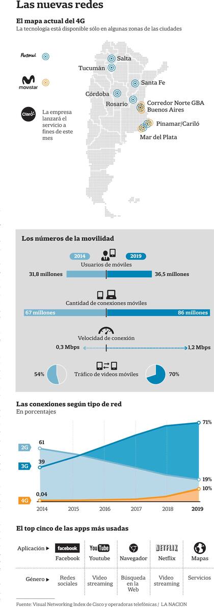 En 2019, el 84% de los argentinos, unos 36,5 millones, será usuario de telefonía móvil. Para entonces habrá 86 millones de conexiones (dispositivos personales o vinculaciones por celular entre máquinas), es decir, el equivalente a dos por individuo. De esas conexiones, sólo el 9,9% correrá sobre la nueva tecnología 4G, cuyo despliegue empezó a fines de diciembre del año pasado. El 71% de los usuarios utilizará el 3G, que en cantidad de conexiones recién superará al 2G el año próximo.