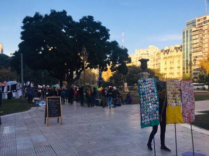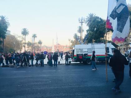 Están todos. Vendedores de paty, de pochoclos, la policía y los vendedores de pañuelos, pero aún no se comenzó a instalar el escenario en la Plaza de Mayo. En la columna del movimiento Tupac Amaru, que esperan solos junto al Cabildo, dicen que está llegando el camión que lo trae.