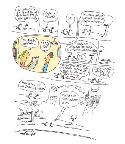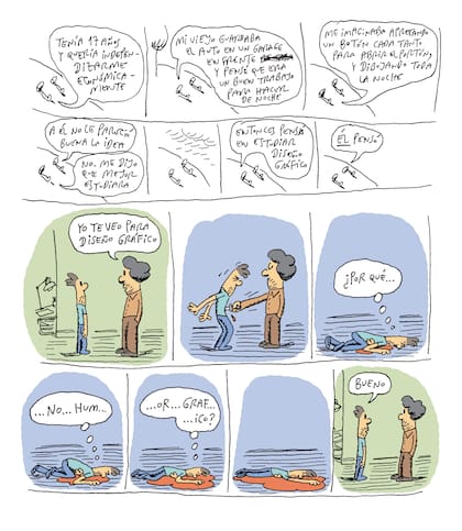 Diario de un Hijo es también un duelo dibujado. "Cuando mis viejos se separaron yo tenía 15 años. Era adolescente, estaba haciendo mi vida, una época donde las amistades son fundamentales. Claro que me dolió, pero no pude darle la dimensión real en ese momento. Un día estaba en el colectivo y sentí que me quedaba sin aire. Fue de repente. No entendía qué me pasaba. Hasta que muchos años después, con análisis, supe que eso era angustia. Lo mismo se replicó con la enfermedad de mi viejo. Estaba en el auto yendo al centro y me quedé en medio de un embotellamiento. Era el día que habían matado a Mariano Ferreryra [militante del Partido Obrero que participaba de una manifestación]. La zona sur de la ciudad estaba colapsada y tuve la misma sensación que en el colectivo, a los 15 años", explica Tute, y convida un mate. "Estaba angustiado. Hubo una etapa previa a su muerte que fue muy dolorosa. No somos de lágrima fácil en la familia. La sensibilidad está, pero a veces cuesta que salga".