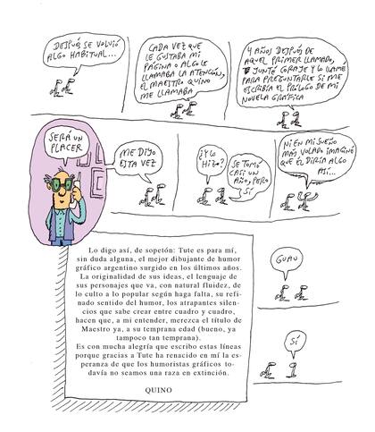 Algunos años después, Tute le pidió a Quino si podía escribir unas pocas palabras para la solapa de su nuevo libro. "Pocas palabras es más difícil que muchas", respondió el maestro. O sea, no. Habían pasado otros cinco años cuando, en medio de una góndola de supermercado, a Tute le sonó el celular. Era Quino, llamaba para felicitarlo por la página que había salido ese día. Y dice que el gesto, cada vez que la crítica del gran maestro lo consideraba, se volvió habitual. Otros cuatro años tuvieron que pasar para que Tute tomara coraje y volviera a la carga con un nuevo pedido. Esta vez, que escribiera el prólogo de su novela gráfica.