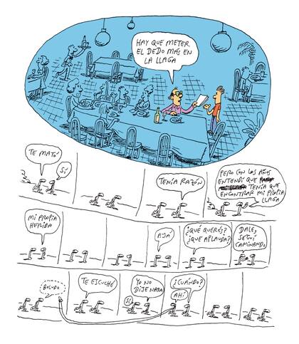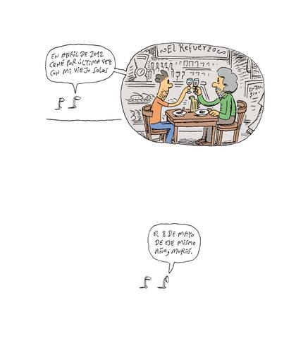 Cenaron juntos, los dos solos, en abril de 2012. Por última vez. "Para ese entonces, mi viejo estaba muy enfermo. Pero nunca supuse que iba a ser la última. Fue una linda cena. Hacía muchos años que no comíamos solos", recuerda. Sí lo hacían a diario cuando Tute, dos años después de terminar el colegio secundario, decidió mudarse de José Mármol, la casa con fondo donde había vivido toda su infancia en familia, al departamento de Caloi, que luego de la separación se había instalado en San Telmo. En aquellos años, arriesga Tute, fue una decisión espontánea que tenía que ver con su ingreso a la facultad y su vida universitaria. "Vivíamos los dos solos, y teníamos las dos mesas de dibujo a pocos metros de distancia. Eso fue muy estimulante, charlábamos mucho. Nos divertíamos", recuerda. La terapia, una vez más -y siempre presente tanto en la vida como en sus dibujos- le dio otro significado a esa convivencia. "Yo necesitaba encontrarme con mi viejo". Esa noche de abril en San Telmo, lo invitó a un boliche del barrio: El Refuerzo. "Charlamos un montón. Cuando nos fuimos, como él había dejado el auto enfrente en un garaje, lo acompañé. Y nos cruzamos con dos chicas que iban a buscar sus bicicletas. Mi viejo les dijo algo y ellas le sonrieron. Le dieron bola -cree Tute-. Siempre fue un gran seductor".