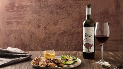 Brochette de pollo satay junto a una copa de Bravío Australia