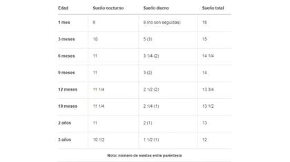 Igualmente, aunque cada chico puede necesitar tiempos distintos de descanso, me pareció útil tener un estimado de cuánto es sano que cada chico duerma, como se ve en esta tabla realizada por el sitio BabyCenter, para darnos una idea de si nuestros hijos están durmiendo lo suficiente: