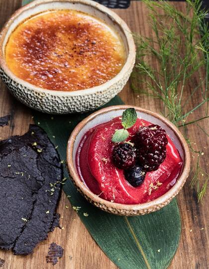 El toque nikkei a la clásica Créme Brûleé tenía que venir de la creatividad de Eddie Castro, el chef al frente de Osakacombinó leche de coco, frambuesa, miso y chocolate, entre otros ingredientes, para sorprender con esta propuesta: un postre dulce con tonos salados que se siente más en la garganta que en el paladar.
