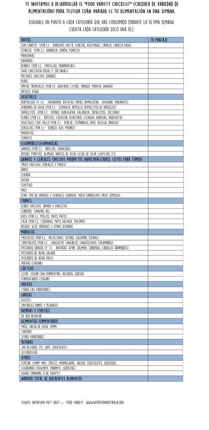 Los humanos necesitamos más de 60 nutrientes provenientes de los alimentos. El "Food Variety Score" indica que 30 nutrientes por semana o 12 por día es un parámetro excelente; 20 por semana es óptimo, 15 por semana es marginal y 10 por semana es inadecuado.