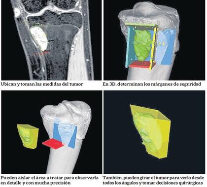 Cuando atiende a un paciente con cáncer óseo diagnosticado, el grupo combina imágenes por tomografía computada y resonancia magnética para obtener un detalle preciso del tumor a operar. Así, el cirujano puede ensayar en la pantalla de una computadora cómo será la intervención cuantas veces quiera o necesite. Puede determinar las características del tumor, planificar los cortes más convenientes y elegir de un banco de huesos de donante la pieza más adecuada para la reconstrucción.