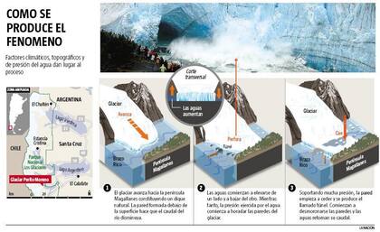 Mañana, pasado, el martes? todos lanzan pronósticos. Para Horacio Svetaz, un histórico guía de turismo del parque, "el glaciar podría romper el lunes". Ayer, a través del túnel de hielo, el agua fluía sin cesar. Sin embargo, según los datos oficiales, la diferencia de seis metros entre los dos espejos de agua sólo había descendido 50 centímetros.