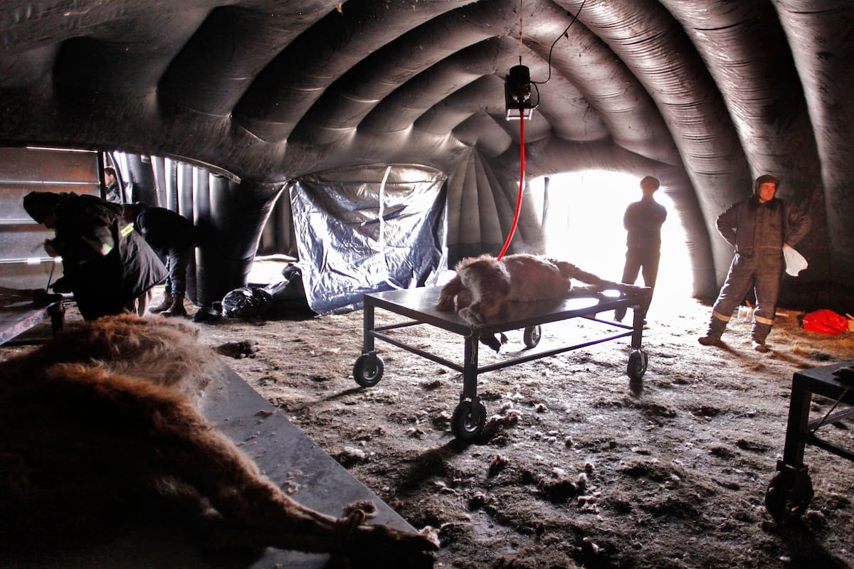 En el mismo galpón de esquila hay una dependencia de la parte inicial de aprovechamiento de carne que luego es derivado al frigorífico habilitado para la venta. En la esquila se tomaron muestras en el marco del plan PROLANA de la provincia y van a ser procesadas en laboratorio de INTA y CAP en tanto que en el INTI se investigará el aspecto textiles y a partir de allí se definirá el tipo de desarrollo. Al final del día, los corrales de caño y el galpón inflable es desarmado en horas y no dejará huellas en la estepa.