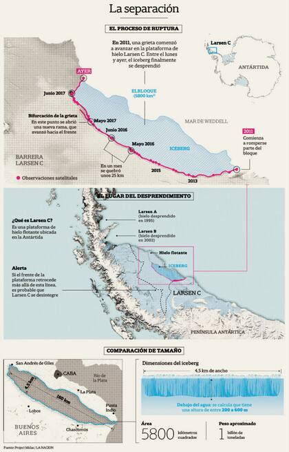 Mide 5800 km2, 25 veces el tamaño de la Capital; los científicos venían monitoreando la grieta, que se inició hace alrededor de siete años; en los últimos meses advirtieron que la masa de hielo pendía de un hilo