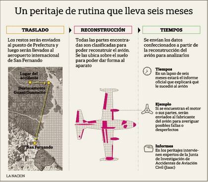 No menos de seis meses de exhaustivos estudios se necesitarán para determinar las razones por las cuales el avión Mitsubishi LV-MCV terminó en un cráter pantanoso en el delta entrerriano, pocos minutos después de haber despegado del aeropuerto de San Fernando el 24 del mes pasado. Es que a la dificultosa y minuciosa tarea de recuperar la mayor cantidad de partes de la nave siniestrada le sucederán varios pasos técnicos en la Argentina y en el exterior.