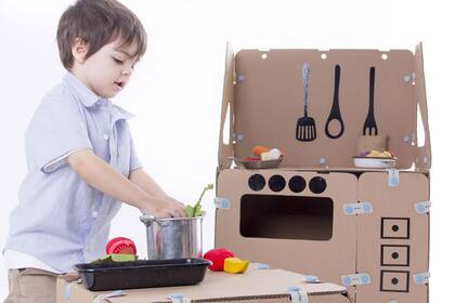 Cocineritos en acción | El fibreboard (cartón triple reforzado), junto a conectores de plástico flexible, son los materiales que dan vida a la original y tentadora cocinita de Ikitoi. Con el aval de la reconocida cocinera Narda Lepes, se trata de un escenario flexible, para que los niños puedan sentirse, además de súper cocineros, artífices de su propio espacio de juego.