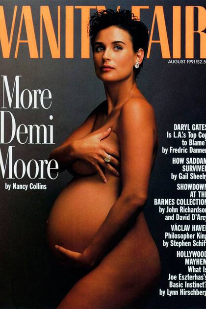 Leibovitz también había fotografiado a una Demi Moore embarazada en 1991 para la memorable portada de la misma revista. Las similitudes de las portadas son muchas: Demi Moore también estaba desnuda con un poco de joyería en un fondo gris.