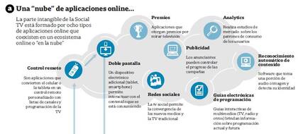 Además de las apps de control remoto, ese nuevo "ecosistema social" incluye redes sociales; aplicaciones de segundas pantallas, que permiten interactuar con los contenidos que se están viendo; software de análisis que permite conocer información sobre la audiencia en tiempo real, y sistemas de reconocimiento automático de contenidos, que permite usar fragmentos de audio o video en lugar de palabras escritas para buscar series o programas. Y detrás de todas esas novedades está la llamada computación en la nube o cloud computing, que convierte a Internet en el lugar donde se almacenan la información y el software necesario para procesarla.