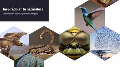 Libélula: los ojos compuestos de una libélula adulta tienen casi 24,000 ommatidios cada uno. A diferencia de los humanos, las especies de libélulas voladoras tienen cuatro o cinco opsinas diferentes, lo que les permite ver colores que están más allá de las capacidades visuales humanas, como la luz ultravioleta (UV). Las libélulas (y las abejas) tienen los ojos compuestos más grandes entre los insectos; y los ojos cubren la mayor parte de su cabeza, asemejándose a un casco de motocicleta. En contraste con el ojo humano, cada faceta dentro del ojo compuesto apunta en una dirección ligeramente diferente y percibe la luz que emana de solo una dirección particular en el espacio, creando un mosaico de imágenes parcialmente superpuestas. Las libélulas también pueden detectar el plano de polarización de la luz y la utilizan como una especie de “brújula del cielo” para poder orientarse. Bioinspiración: disposición hexagonal de los elementos ópticos compuestos en el casco. Rango de comunicación ultravioleta (no visible a simple vista). Luz polarizada como fuente adicional de navegación.